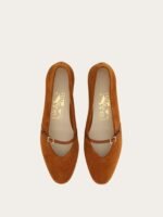 Designed in 1954 for Audrey Hepburn, this suede ballet shoe is a symbol of the fashion history and a testament to Ferragamo’s impeccable craftsmanship. It features a delicate kidskin strap and a buckle that add a touch of sophistication. The low, oval heel and shell-shaped sole draw inspiration from Native American opanke moccasins, merging comfort with style.