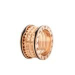 The B.zero1 Rock collection draws inspiration from the world-famous amphitheater, the Colosseum, and reflects Bvlgari??s creative vision and uninhibited style. The unique spiral design is reinterpreted with gold studs, challenging the essence of jewelry aesthetics and highlighting the freedom and forward-looking spirit of Bvlgari??s classic design. B.zero1 Rock collection 18K rose gold four-band ring inlaid with black ceramic.