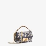 Iconic small Baguette bag made of jacquard fabric with the iconic FF motif in shades of blue, embellished with blue embroidered borders, beige leather details and embellished with an FF clasp.