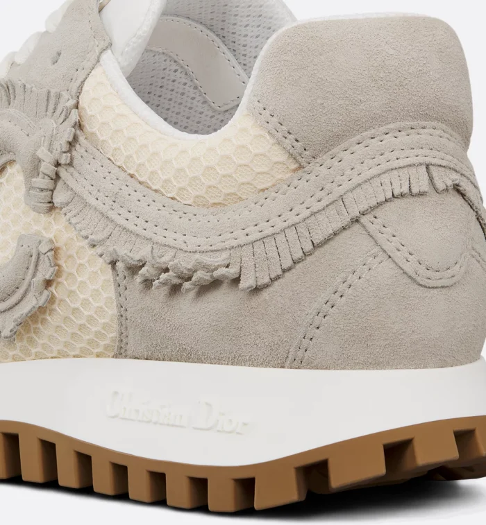 The C’est Dior sneaker is a bold, modern creation. The pairing of ecru suede calfskin and mesh is enhanced by the letters C and D on each side of the upper, while fringed details add a touch of elegance. The ultralightweight, two-tone Dior sole accentuates the sportswear appeal while offering maximum comfort. The sneaker will add a modern touch to all laid-back looks.