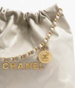 The Small 22 Hobo Bag is crafted in beige calfskin with antique gold hardware and features the signature diamond quilting, antique gold metal front with a removable pouch and a long antique gold and beige leather chain.