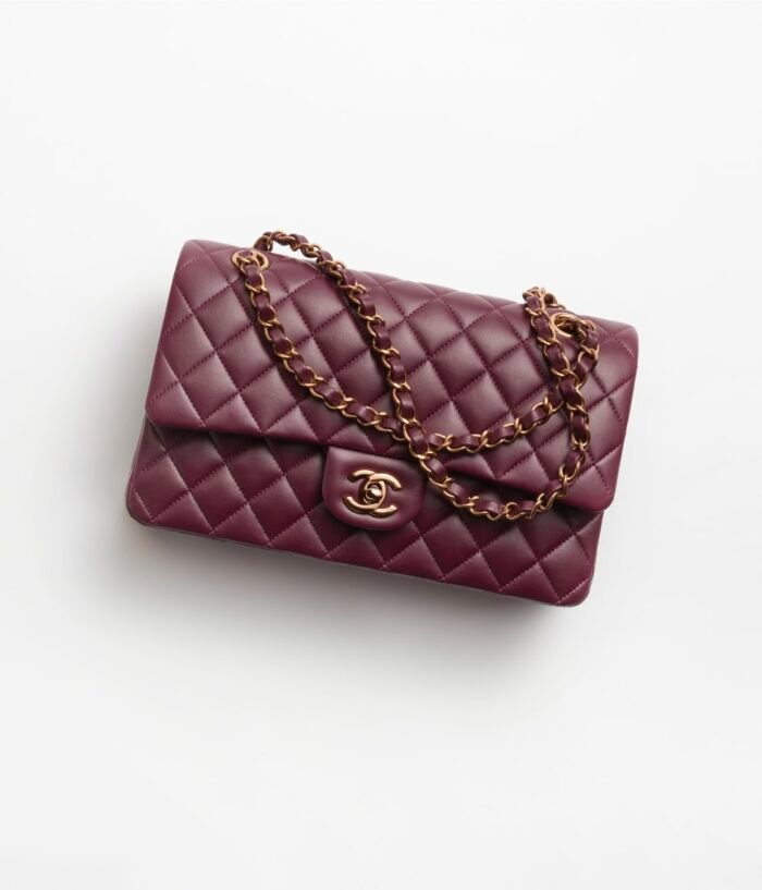 This flap bag is made of burgundy lambskin with gold hardware, front flap with signature CC turnlock closure, half-moon back pocket, adjustable gold interwoven chain link and burgundy leather shoulder strap.