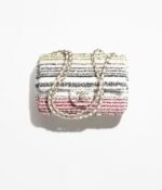 This Chanel mini striped flap bag is of black, white, pink and yellow sequins with light gold hardware and features a front CC turnlock closure, tonal stitching, and one interwoven white leather and light gold chain shoulder/crossbody strap.