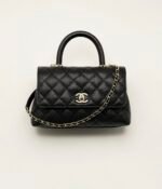 This medium rectangular flap bag with top handle is made of black lambskin with gold hardware, front flap with CC turn lock closure, half moon back pocket, top handle and black leather shoulder/crossbody strap.