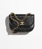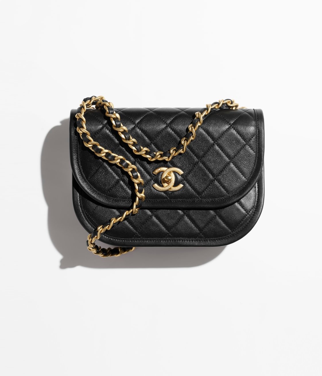 This flap bag is crafted from black quilted caviar leather with antique gold hardware and features a CC logo front flap, antique gold chain links and a black leather padded shoulder/crossbody strap.
