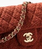 This Chanel Mini rectangular flap bag in dark brown tweed features light gold hardware, front flap with CC turnlock closure, half-moon back pockets, interwoven light gold chain links and brown shoulder/crossbody strap.