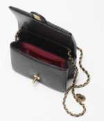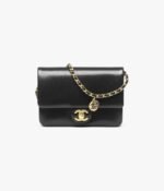 This Chanel Mini Flap Bag is crafted from black grained shiny calfskin with brushed gold hardware, front flap with CC turnlock closure, single interwoven brushed gold and black leather shoulder strap with two round CC coin charms.