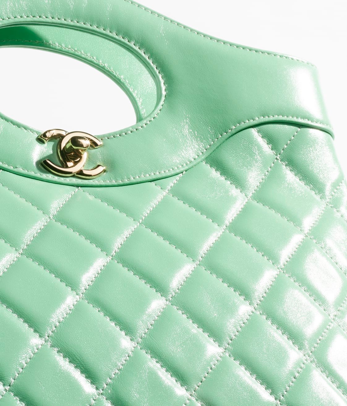 This Chanel 31 shopping bag is made of light green lambskin with gold hardware, cut-out top handles, magnetic snaps, CC logo on the front of the bag, and a shoulder strap that is an interwoven light green leather and gold chain link.