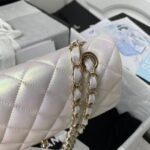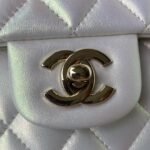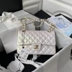 This small Classic Double Flap Bag in gradient cream lambskin with silver hardware features a front flap with signature CC turnlock closure, half-moon back pocket, adjustable silver interwoven chain links and gradient white leather shoulder strap.