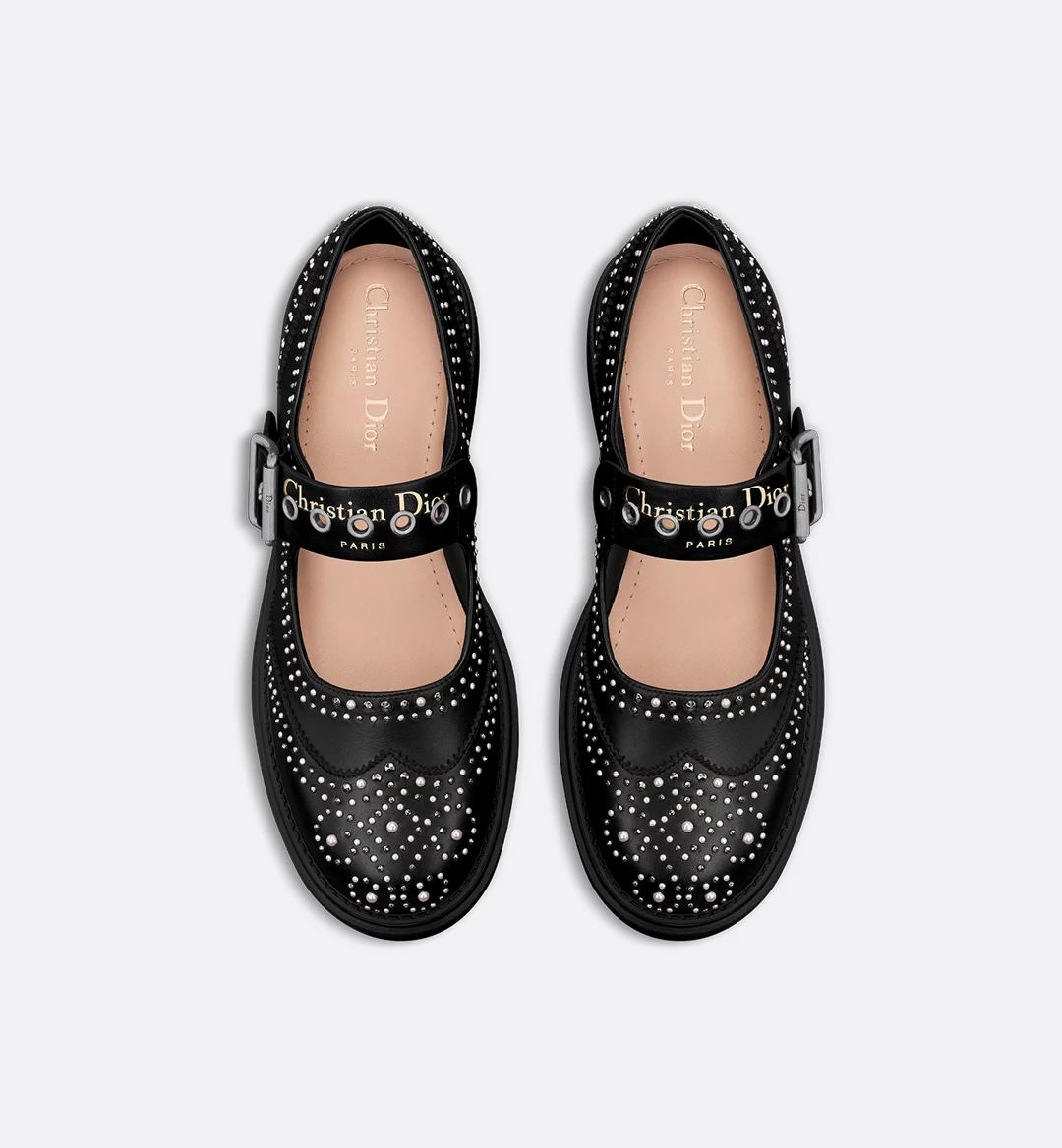 New for Cruise 2025, the D-Society baby revisits the Mary-Jane through the Dior couture spirit and the punk codes of the collection. The black calfskin upper is enhanced by silver-finish studs and white resin pearls, while the adjustable strap with silver-finish metal buckle and eyelets is elevated by the gold-tone Christian Dior Paris signature. A thick yet ultralightweight notched sole completes the piece with a bold look.
