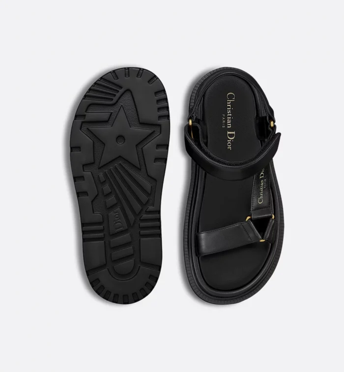 The D-Wave sandal highlights a hybrid silhouette with a modern aesthetic. The style has black lambskin straps enhanced by the gold-tone Christian Dior Paris signature on the side. Completed by an ultralightweight and comfortable notched EVA sole, the sandal will lend a contemporary touch to any of the season’s looks.