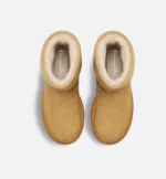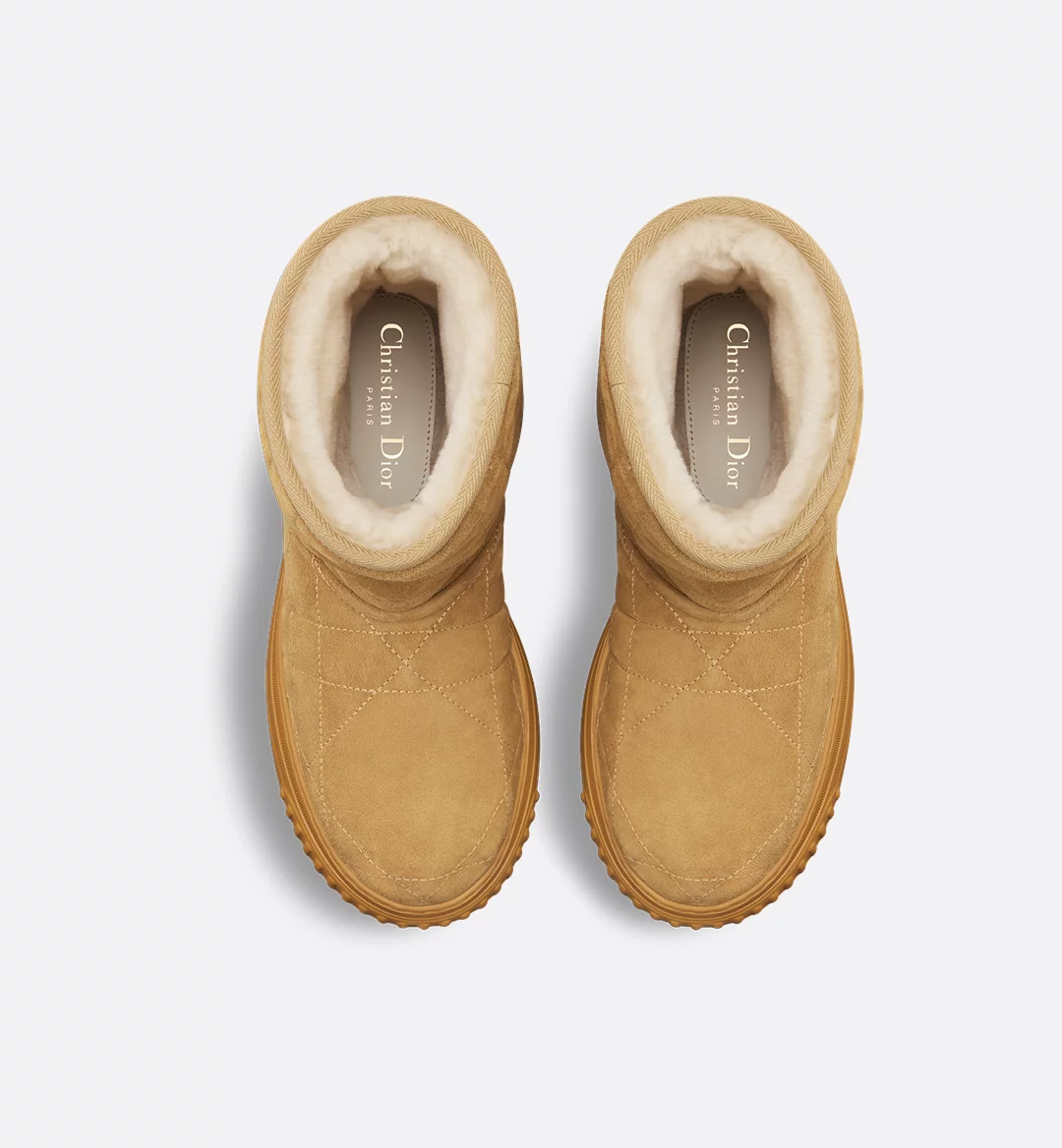 The Dior?Frost ankle boot reframes the apr??s-ski style in a couture variation. The camel suede upper showcases the Cannage motif, while the ecru lambskin shearling interior offers optimal comfort. A gold-tone Christian Dior Paris signature on a tonal leather panel highlights the back, while the ultralightweight rubber logo sole completes the comfortable shoe.