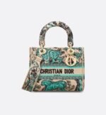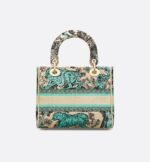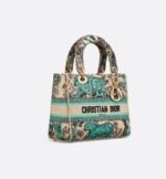 Part of the Dioriviera capsule, the Lady D-Lite bag combines classic elegance with House modernity. The raffia style is fully embroidered with the Toile de Jouy Sauvage motif in aquamarina. A Christian Dior Paris signature adorns the front, while D.I.O.R. charms in pale gold-finish metal further enhance and highlight the silhouette. Featuring a wide, removable embroidered shoulder strap, the medium Lady D-Lite bag can be carried by hand or worn crossbody.