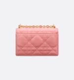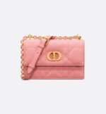 The new Fall 2023 Miss Caro mini bag enhances the Dior Caro line with modern and timeless elegance. Crafted in light pink lambskin, it stands out with the unique quilted effect of Macrocannage stitching, as well as a flap accented by a gold-finish metal CD twist clasp inspired by the seal of a Christian Dior perfume bottle. Alternating between gold-finish metal links and tonal enamel links that match the leather, the adjustable chain shoulder strap has a leather insert for added comfort when carrying the bag by hand, wearing it over the shoulder or crossbody.