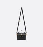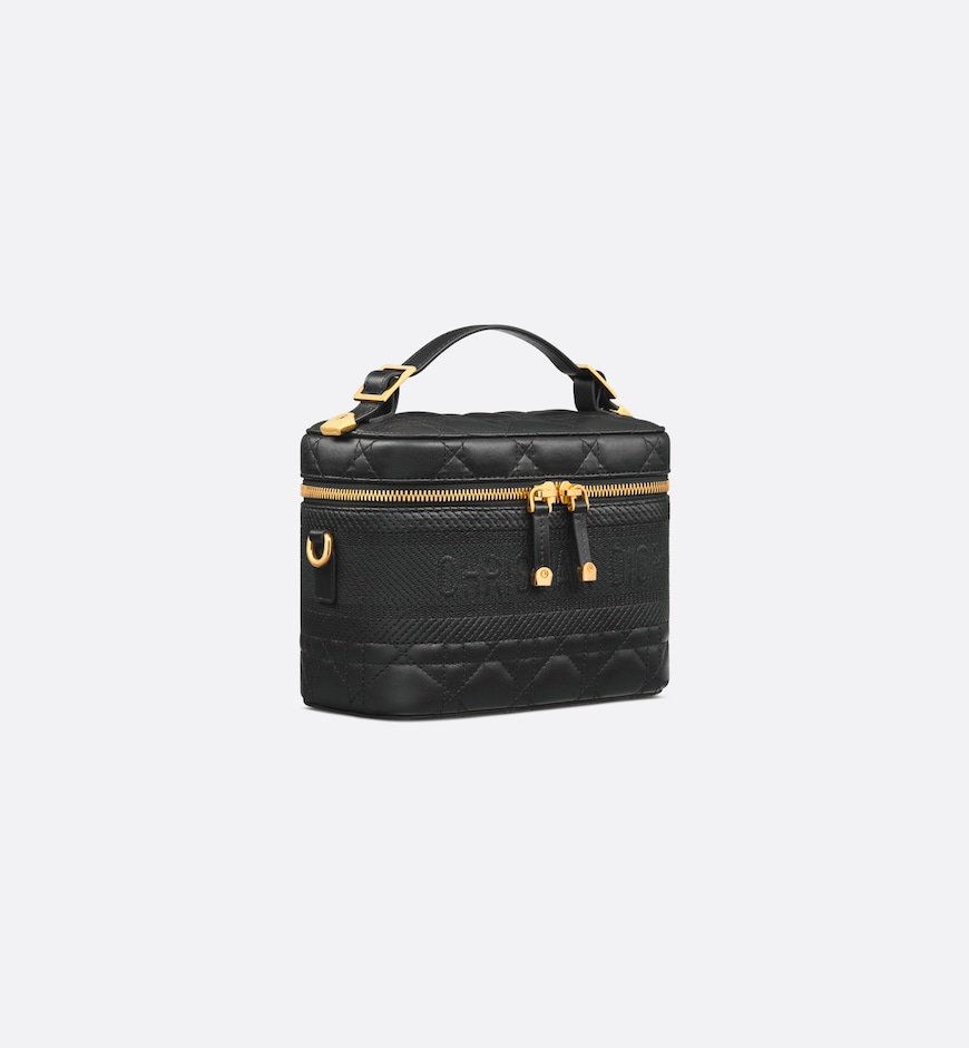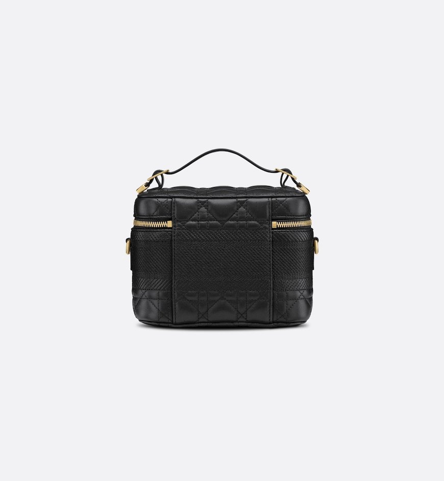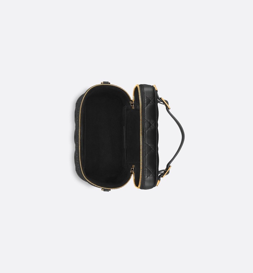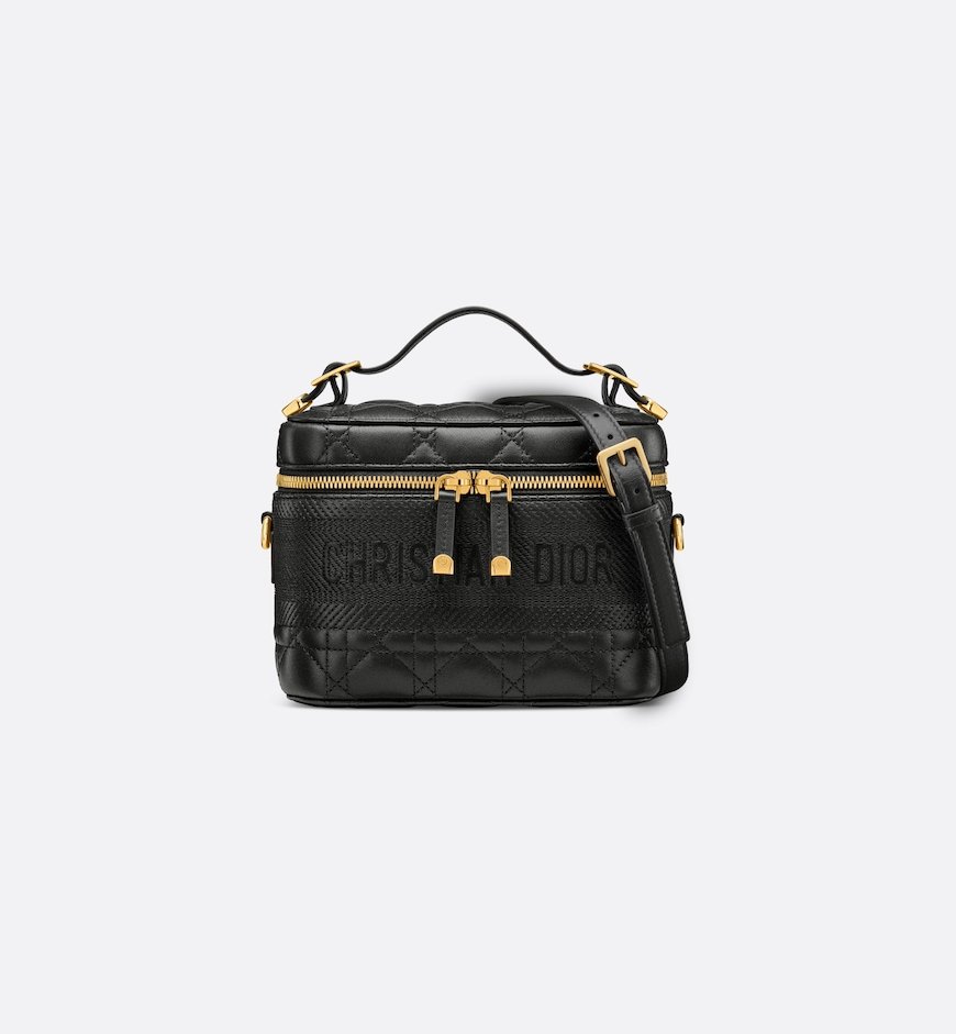 The DiorTravel vanity case is crafted in black supple lambskin and showcases shiny antique gold-finish metal details. It is enhanced by Cannage topstitching and a band embossed with the Christian Dior signature. The design can accommodate a phone, a wallet, a case for wireless earphones and a notebook. The small accessory is an ideal daily companion and can be carried by hand, worn over the shoulder or crossbody thanks to its handle and removable shoulder strap.