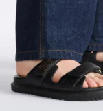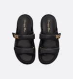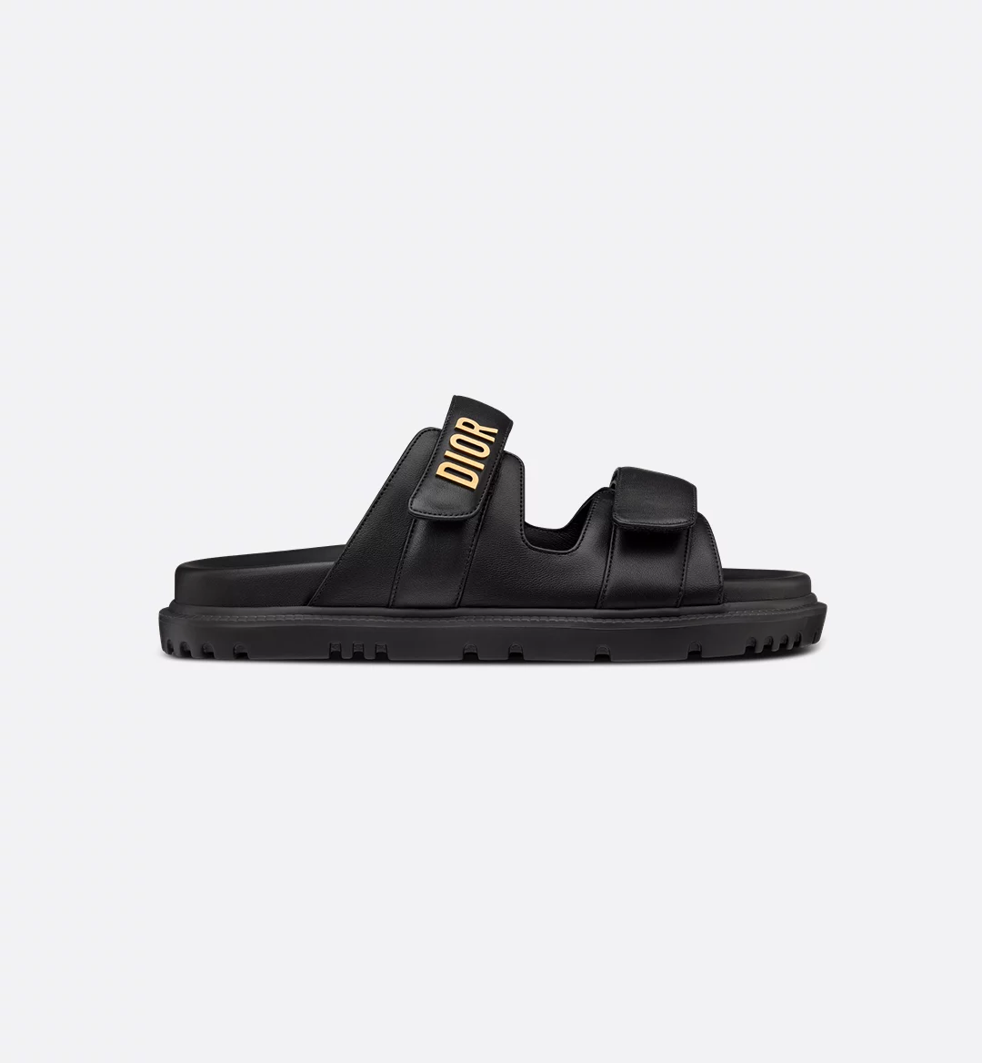 The black lambskin Dioract slide has a modern silhouette. The style features an anatomically shaped insole made with an ultralightweight and comfortable leather. Self-fastening straps are further enhanced by a gold-finish metal Dior signature on the upper strap. The slide will lend a contemporary touch to any look.