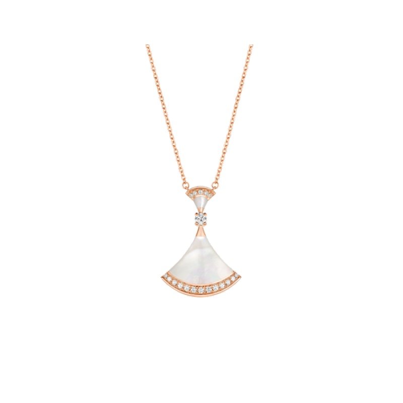 The Divas’ Dream necklace embodies Italian elegance and unleashes feminine power with a mysterious and unforgettable temperament. The charming and exquisite pendant is decorated with a fan-shaped pattern, inspired by the mosaic decoration of the Caracalla Baths in Rome, and highlights the historical origins of Bvlgari and the “Eternal City” with a modern and fashionable design and a combination of exquisite gemstones. Divas’ Dream necklace in 18K rose gold, inlaid with mother-of-pearl and a round brilliant-cut diamond, decorated with pavé diamonds.