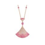 Divas’ Dream necklace in 18K rose gold, set with a central pink sapphire and round pink sapphires (3.53 carats), round rubies (0.81 carats) and round diamonds (0.16 carats), decorated with pavé diamonds (0.85 carats).