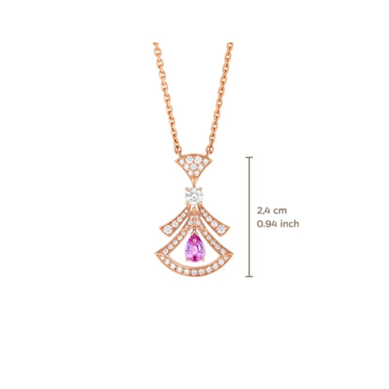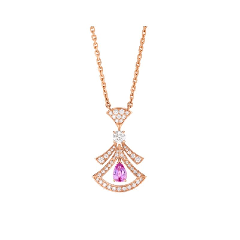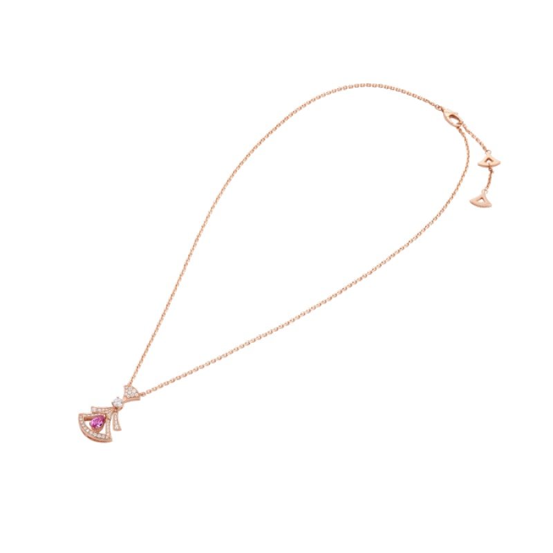 Divas’ Dream necklace in 18K rose gold, set with a pear-shaped pink sapphire and brilliant-cut diamonds.