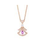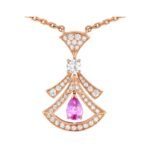 The Divas’ Dream necklace in 18K rose gold is a subtle expression of joyful femininity, with a colorful design that interprets the iconic fan motif. The signature aesthetic of the collection is presented in a diamond-set hollow pendant with a pear-shaped pink sapphire in the center, reflecting Bvlgari’s Roman heritage. This timeless and elegant piece celebrates the beauty of nature and is created to celebrate Chinese Valentine’s Day.