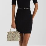 Narrow belt with loop and diagonal FF stud buckle. Made of black leather. Gold-finish metalware.