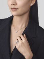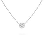 Fleurette pendant, rhodium plated 18K white gold, round diamonds; diamond quality DEF, IF to VVS.The pendant is attached to the necklace’s chain