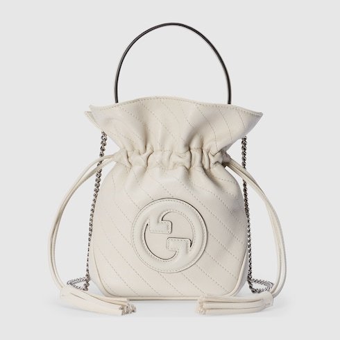 A bold motif of the House, the Gucci Blondie continues to exude subtle style, thanks to its tonal leather appearance. Formed from a rounded geometric version of the Interlocking G, the line exemplifies Gucci’s contemporary design. The logo detail defines this mini bucket bag in white leather with tassel details.