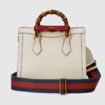 The concept of reinvention continues to shape the House’s designs. An evolution of a bamboo handle tote first introduced in 1991, the Gucci Diana represents the notion of style in constant evolution. The design plays with traditional details and renews them new meaning. Playing with this idea, the functional bands used to keep bamboo handles in shape are reimagined as playful leather belts. Here, the tote is introduced in white leather.