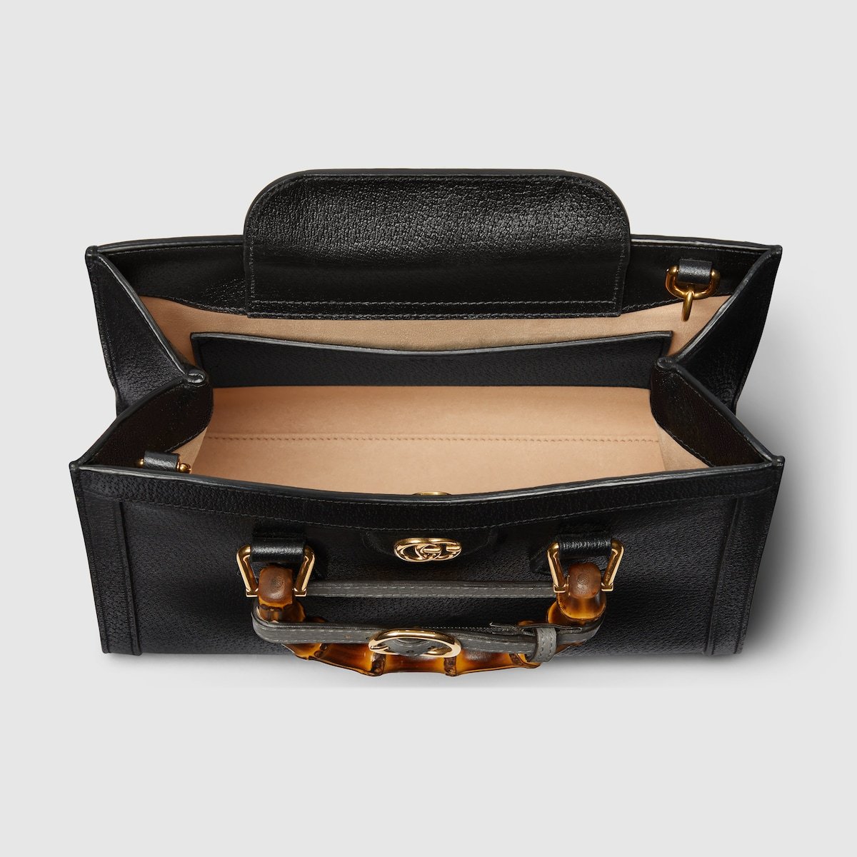 Combining recognizable elements of the House, the small tote bag is defined by its bamboo handles and Double G hardware. Crafted from black leather, the accessory is further accentuated by two colored belt details, a playful reference to the bands used to keep handles in shape.