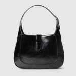 The new Gucci Jackie is crafted from fine leather which highlights the craftsmanship, crescent shape, and sleek silhouette of the House’s iconic shoulder bag. Light gold-toned hook closure, leather trim, and an additional strap featuring the green and red Web gives this Gucci Jackie small shoulder bag in black patent leather further styling options.