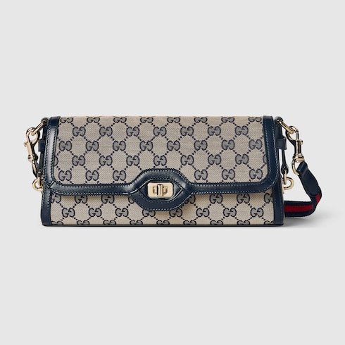Gucci Luce, which translates to light in Italian, radiates playful charm and boundless joy. The Original GG canvas lends itself to this small shoulder bag design. The beige and dark blue motif is accentuated by dark blue leather trim and light gold-toned hardware. The blue and red stripe Web is detachable through a leather loop and hardware ring on the sides, giving the bag additional function and structure.