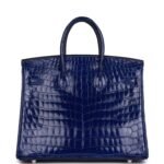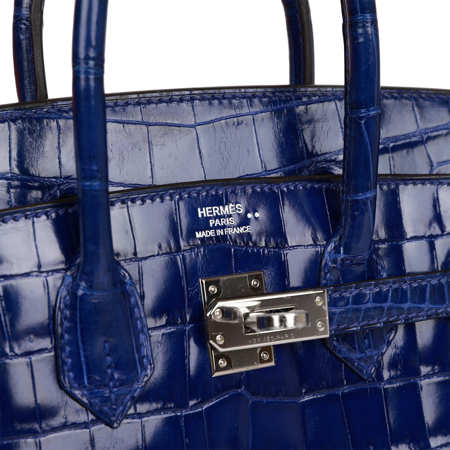 This Birkin is in Bleu Electric shiny Niloticuscrocodile leather withpalladium hardware and has tonal stitching, front strap, two straps with center toggle closure, clochette with lock and two keys and double rolled handles.