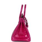 This Birkin is in Rose Sheherazade shinyPorosuscrocodile leather withpalladium hardware and has tonal stitching, front strap, two straps with center toggle closure, clochette with lock and two keys and double rolled handles.