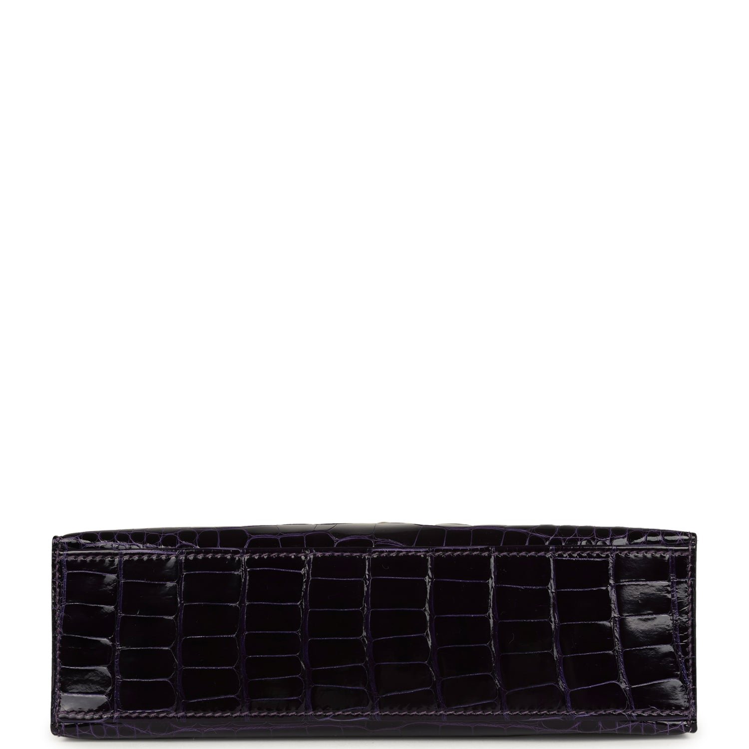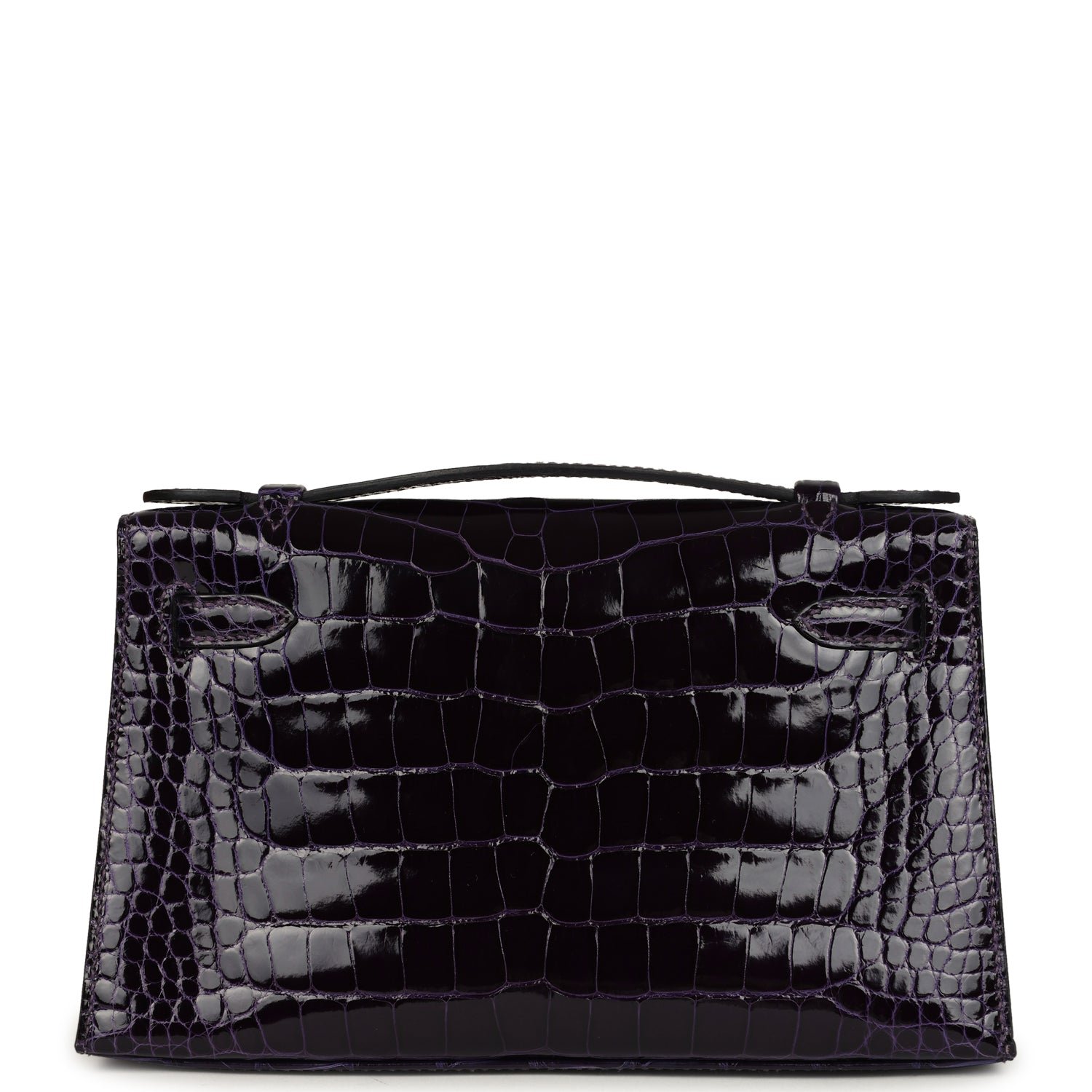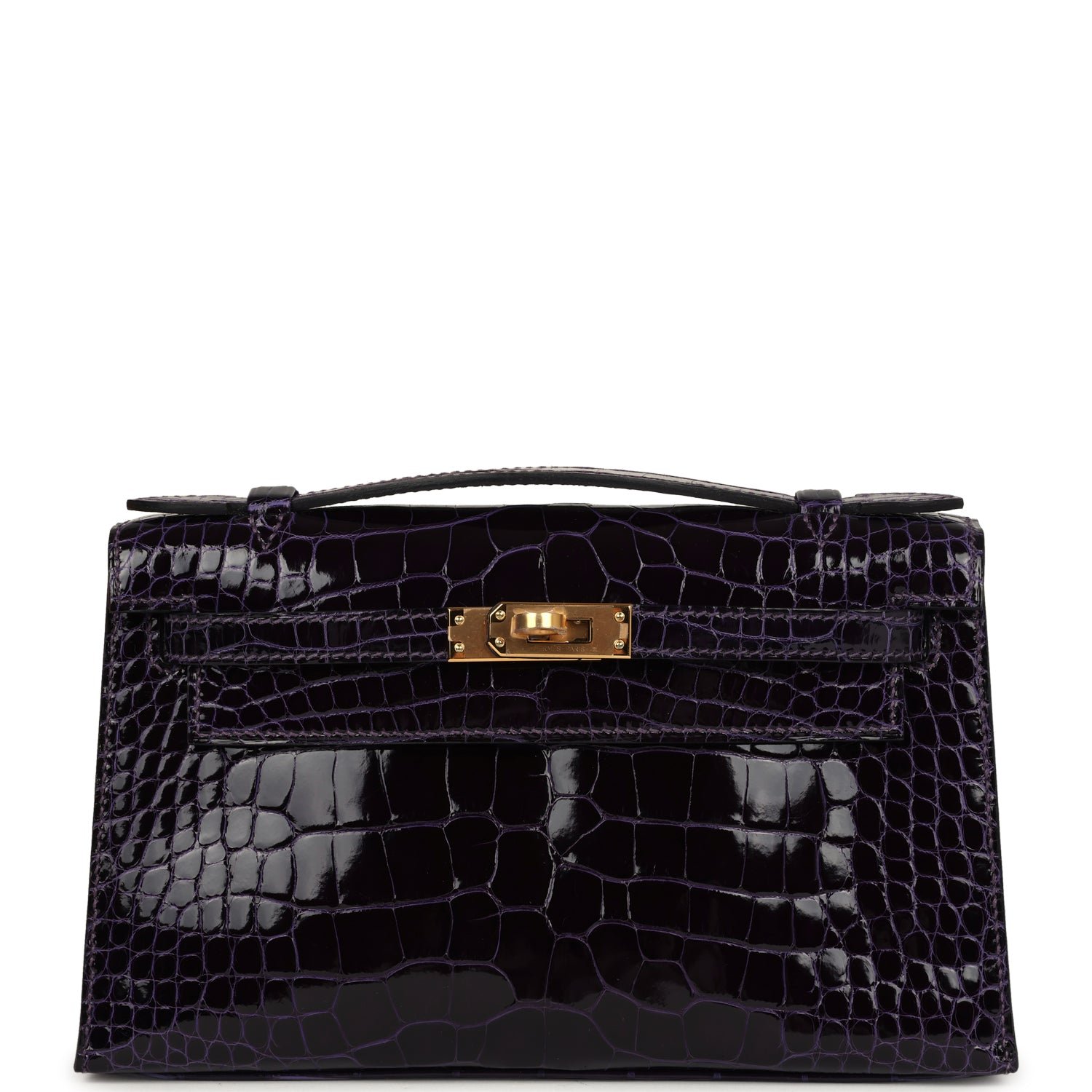 This Kelly Pochetteis inAmethyst Shiny Alligator Mississippiensis with gold hardware, tonal stitching, front flap with two straps, toggle closure and single flat handle.