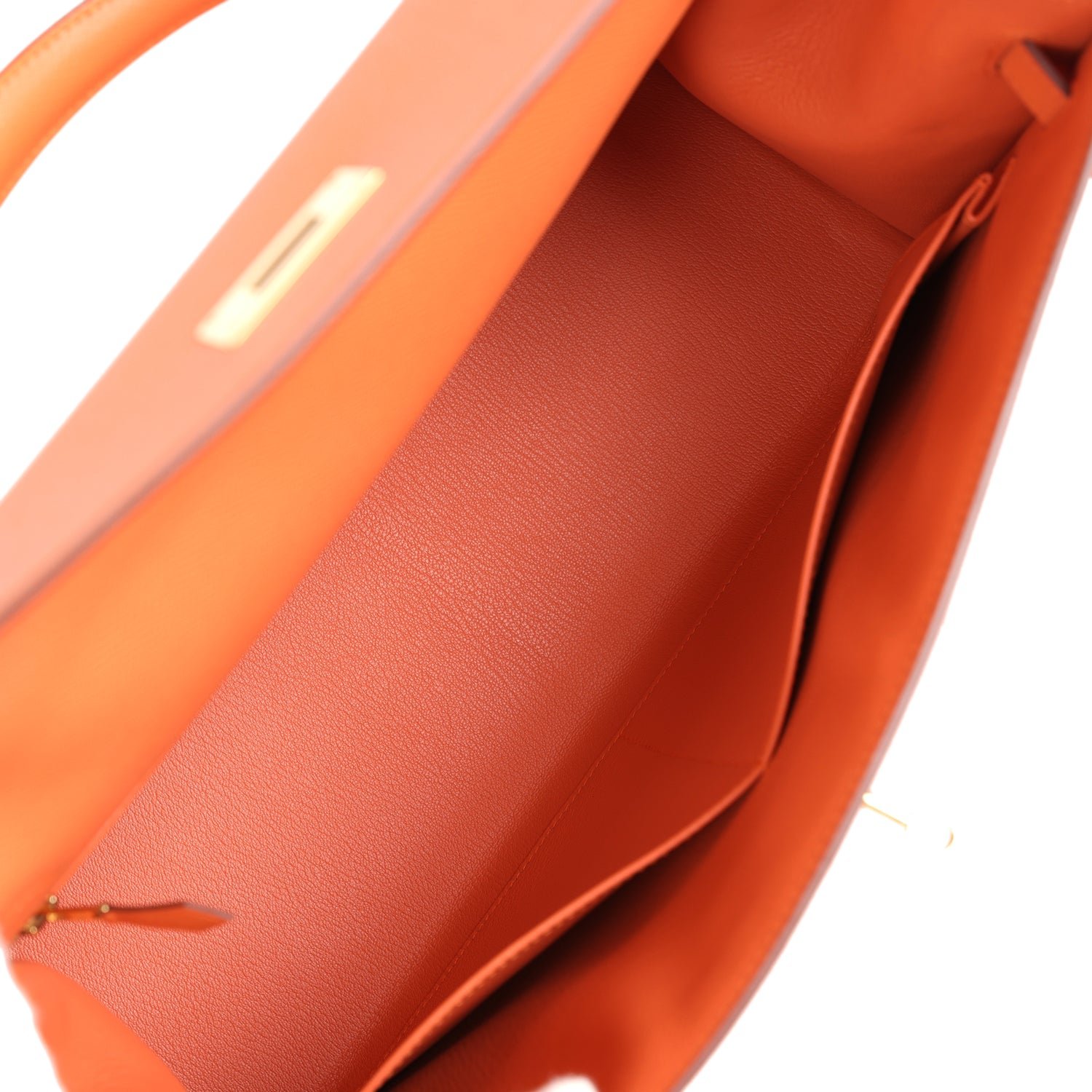 This Kelly, in the Sellier style, is in Mango epsom leather with gold hardware and has tonal stitching, two straps with front toggle closure, clochette with lock and two keys, single rolled handle and removable shoulder strap.