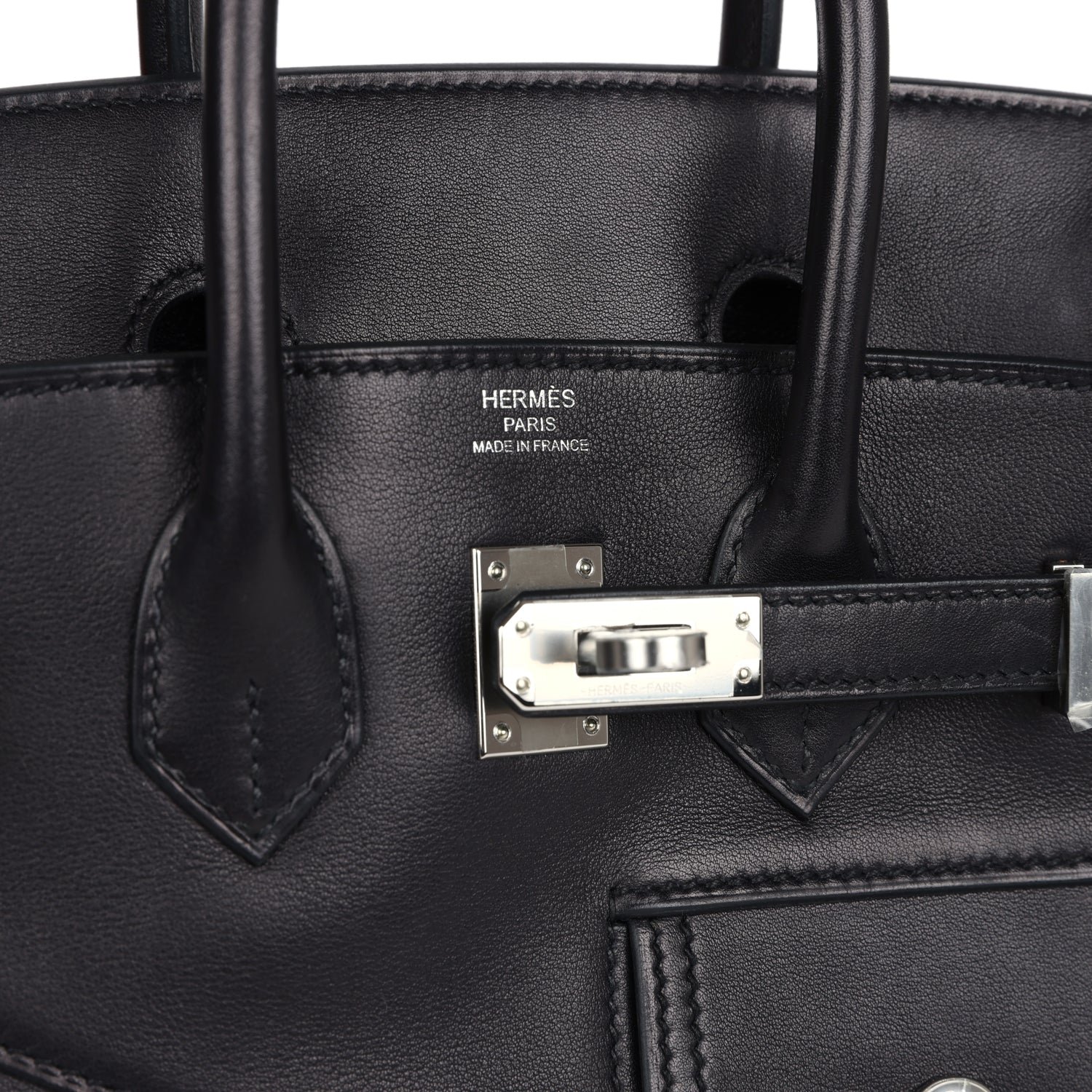 The interior is lined with Black swift and has one zip pocket with an Hermès engraved zipper pull and an open pocket on the opposite side.