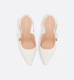 The J’Adior slingback pump is a prime example of Dior’s savoir-faire. Crafted in Christian Dior’s Italian ateliers, the exceptional white cotton design is fully covered with white resin pearls. The tonal J’Adior embroidered ribbon is embellished with a flat bow, while a 10-cm (4) comma heel offers the final elegant touch to the pointed-toe shoe.