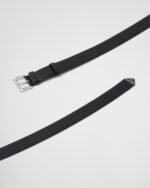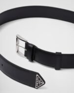 The tip of this leather belt features an iconic, enameled-metal triangle logo, which appeared for the first time on trunks designed by Mario Prada in 1913.