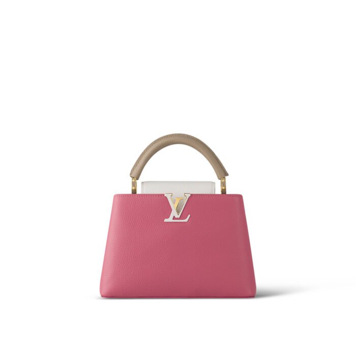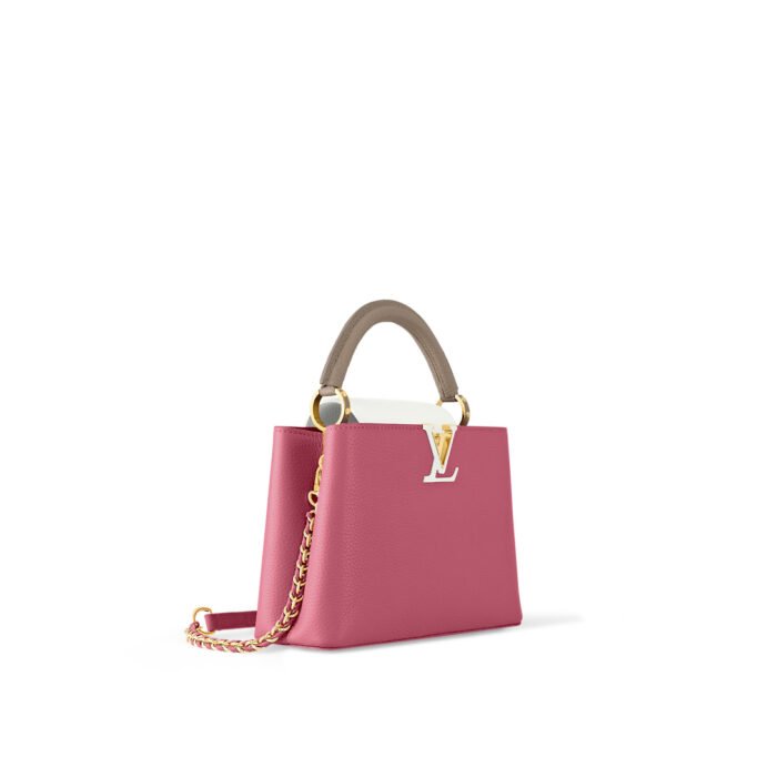 A striking trio of colors on full-grain Taurillon leather and a braided chain strap bring a bold feel to this Capcuines BB handbag. The bag’s structured lines perfectly complement the curve of its single top handle. The versatile Capucines can be carried with the flap outside or tucked into the bag.