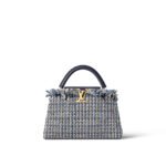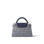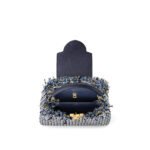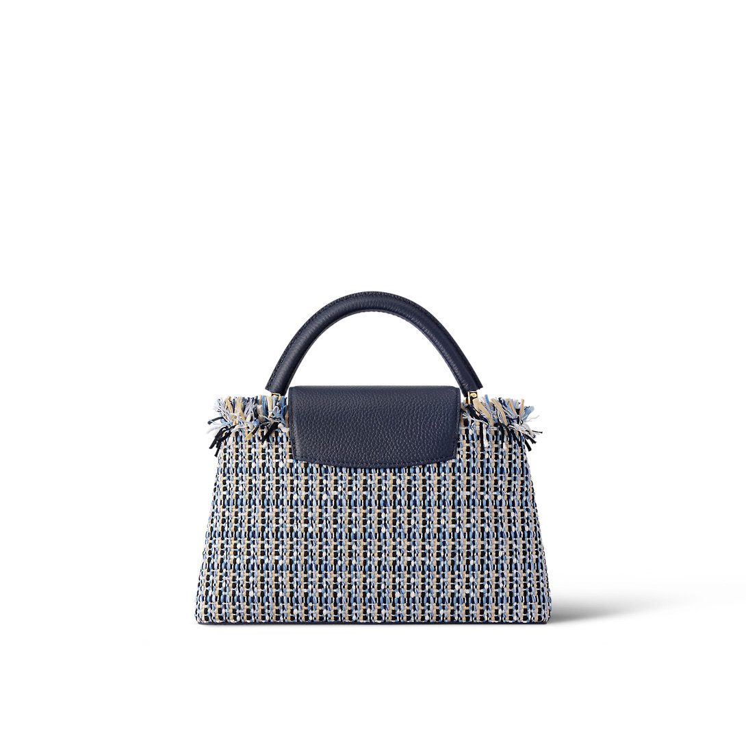 Dressed in a warm, luminous tweed, this season’s Capucines MM handbag is a summery interpretation of the iconic design. The fabric is woven from a mix of navy and white raffia, cotton ribbons and silvery threads, with a fringed finish that gives the bag a crafted look. The flap, handle and strap are made from navy-blue grained Taurillon.