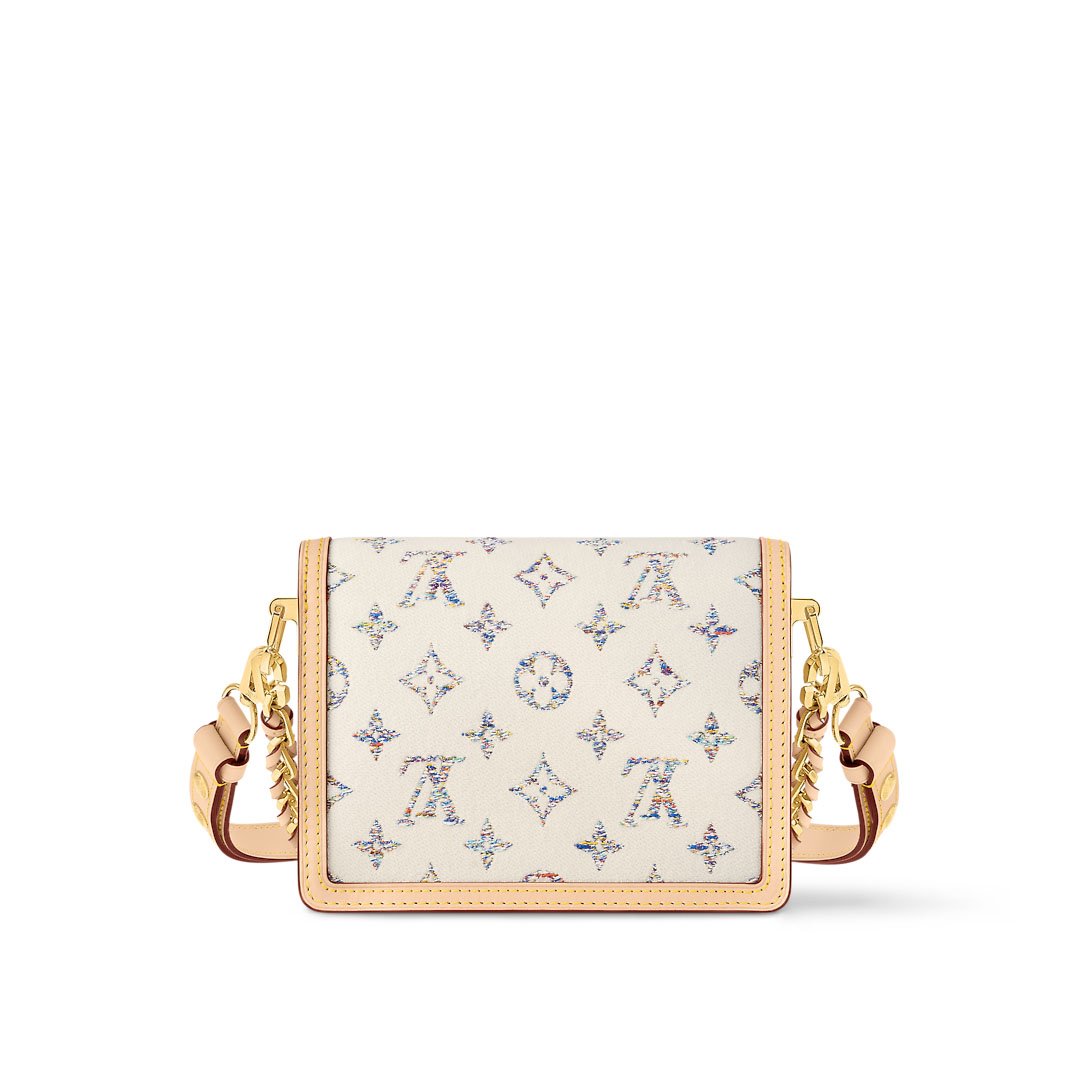 Part of the Nautical capsule, this Mini Dauphine is adorned with multicolor LVs and Monogram Flowers. The jacquard motif is created through a weave using 66 different-colored threads to produce a delicate gradient of color. The fabric then receives a protective coating. The bag features a braided chain and a leather strap – both detachable.