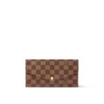 The Sarah wallet comes in Louis Vuitton’s historic Damier Ebene canvas, complemented by a grained-leather lining. This classic wallet combines a feminine look with a highly functional design, including two roomy compartments, a zipped coin pocket and numerous card slots. Its envelope-style flap is sealed with an engraved, gold-tone press-stud.