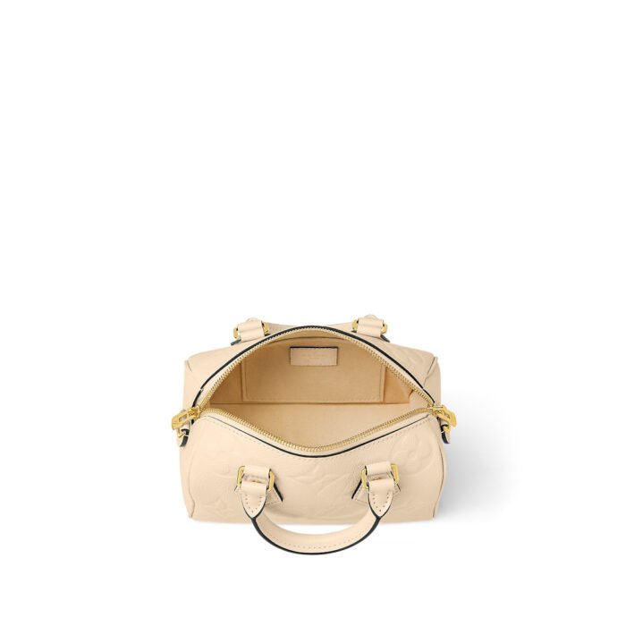 One of the House’s classic silhouettes, the Speedy Bandoulière 20 handbag takes on a timeless elegance in cream-color Monogram Empreinte leather with matching microfiber lining. The bag’s unique lines and two top handles evoke Louis Vuitton’s travel bags from the early 20th century. A removable chain-and-leather strap enables comfortable shoulder and cross-body carry.