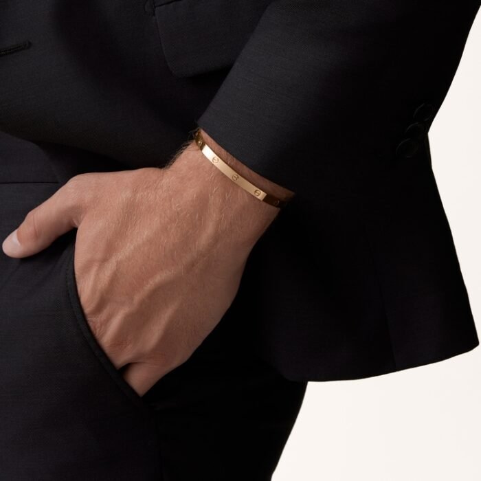 LOVE bracelet, medium model, 18K rose gold (750/1000), closure system with functional screw and hinge. Comes with a screwdriver. Width 4.8 mm. Created in New York in 1969, the LOVE bracelet is a jewelry design icon: a close fitting, oval bracelet composed of two rigid arcs, which is worn on the wrist and removed using a special screwdriver.