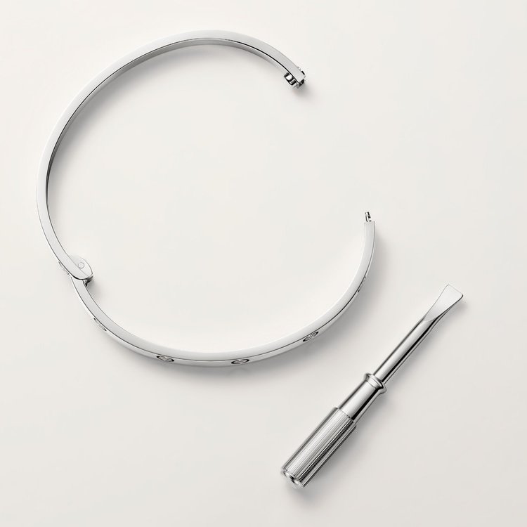 LOVE bracelet, medium model, 18K white gold (750/1000), closure system with functional screw and hinge. Comes with a screwdriver. Width 4.8 mm. Created in New York in 1969, the LOVE bracelet is a jewelry design icon: a close fitting, oval bracelet composed of two rigid arcs, which is worn on the wrist and removed using a special screwdriver.
