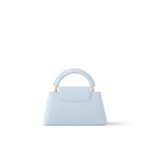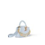 Joyful codes from the re-edition of the Louis Vuitton x Murakami elevate the Capucines East-West handbag into a spirited statement. Takashi Murakami’s vernacular rainbow palette informs the soft blue shade of the Taurillon leather, while the emblematic LV Initials on the front and Monogram Flower accents on the chain are playfully reimagined in the artist’s signature superflat style.