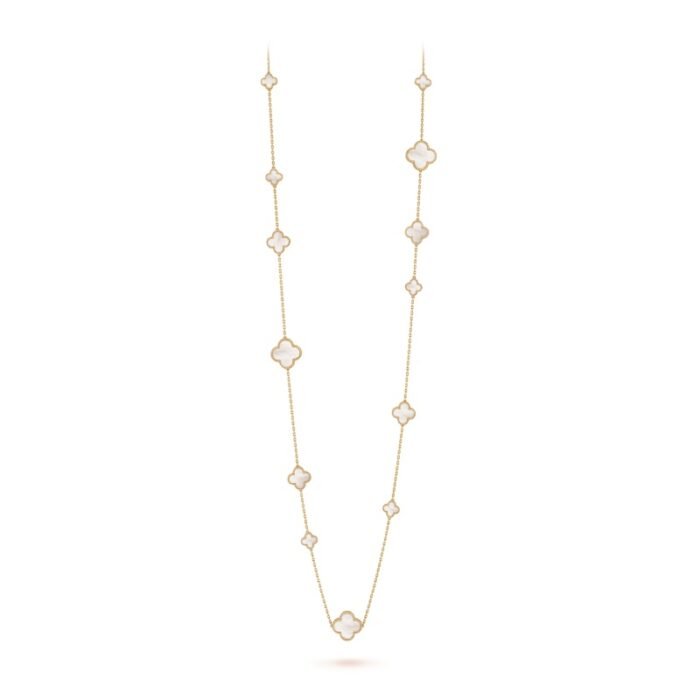 Magic Alhambra long necklace, 16 motifs, 18K yellow gold, white mother-of-pearl.