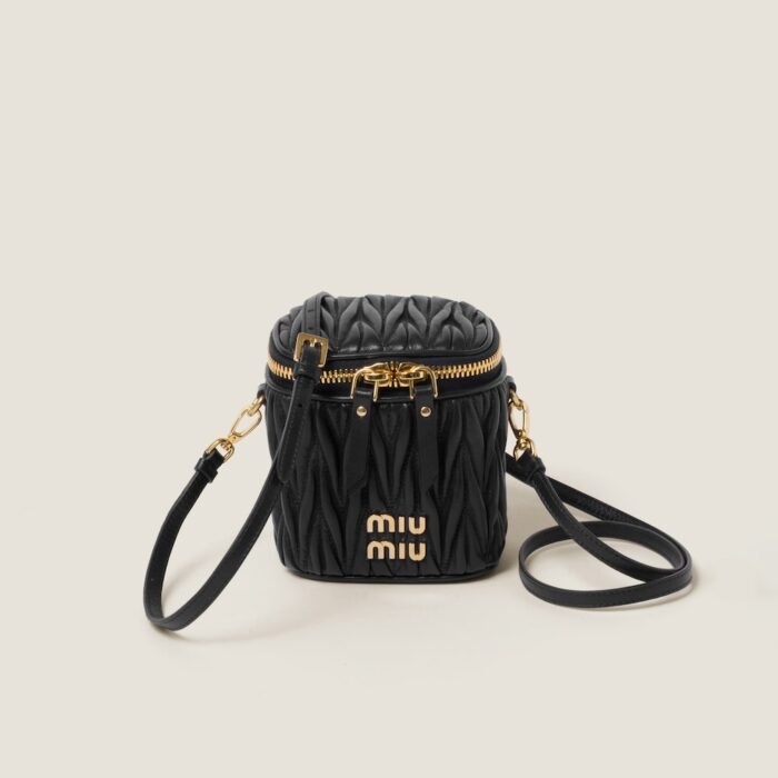 Fine matelassé workmanship gives this nappa leather micro bag a compact and modern look thanks to the three-dimensional, textured, and extremely sophisticated effect. The Miu Miu logo stands out with an iconic and instantly recognizable touch.