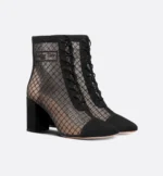 The Naughtily-D heeled ankle boot showcases streamlined, elegant lines. Offering a sophisticated interplay of transparency, the mesh style embroidered with silver-tone strass is embellished with the Christian Dior Paris signature and black suede goatskin detailing. The ankle boot is distinguished by its no-tongue design for an openwork effect. The 8-cm (3-inch) block heel and laces complete the delicate creation.
