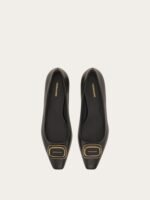 Available in several shades, with various unique color combinations, this new Ferragamo pump will add a touch of personality to any outfit. Made of the softest kid leather, it has a new two tone Gancini buckle at the tip for a nod to sixties style. Low covered heel, leather sole.